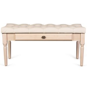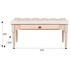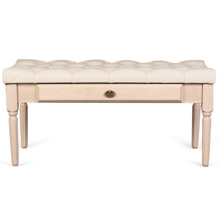 При своей экономичности эта банкетка изготовлена из массива березы, что делает ее надежной в эксплуатации. Стеганая подушка выполнена из экокожи, цвет которой вы можете подобрать из представленных вариантов. Выдвижной ящик предназначен для хранения различных мелочей, его фасад дополнен декоративной ручкой цвета бронзы. Ножки имеют классическую форму на конус с вертикальными фрезеровками.