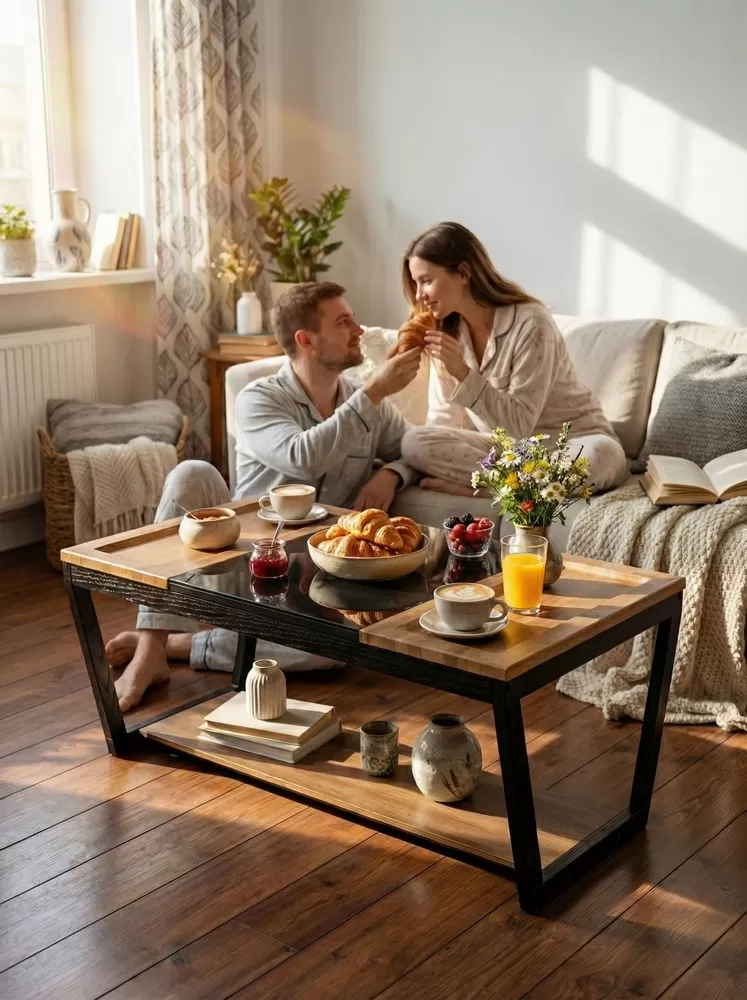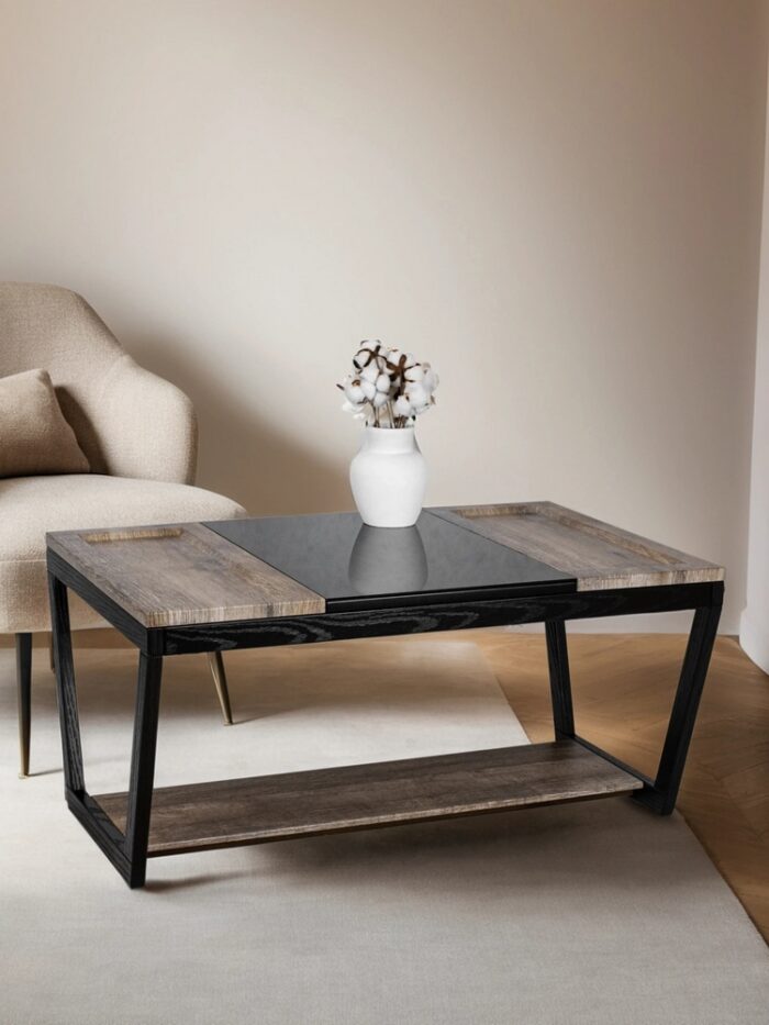 Журнальный стол BeautyStyle 33 — это идеальное сочетание контрастных материалов, создающее уникальный акцент в вашем доме или квартире. Прямоугольная столешница делится на три части: деревянные, выполненные из МДФ, покрытого защитной пленкой, и стеклянная часть. Столик гармонично впишется в любую гостиную, столовую или даже на балкон, придавая вашему дому неповторимый шарм. По бокам стеклянной столешницы расположены два несъемных подноса с небольшими бортиками, что предотвращает возможность соскальзывания предметов.