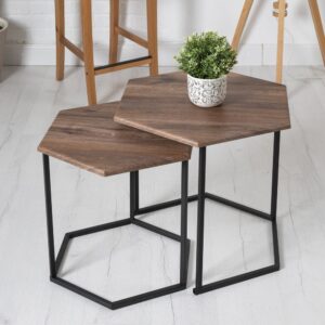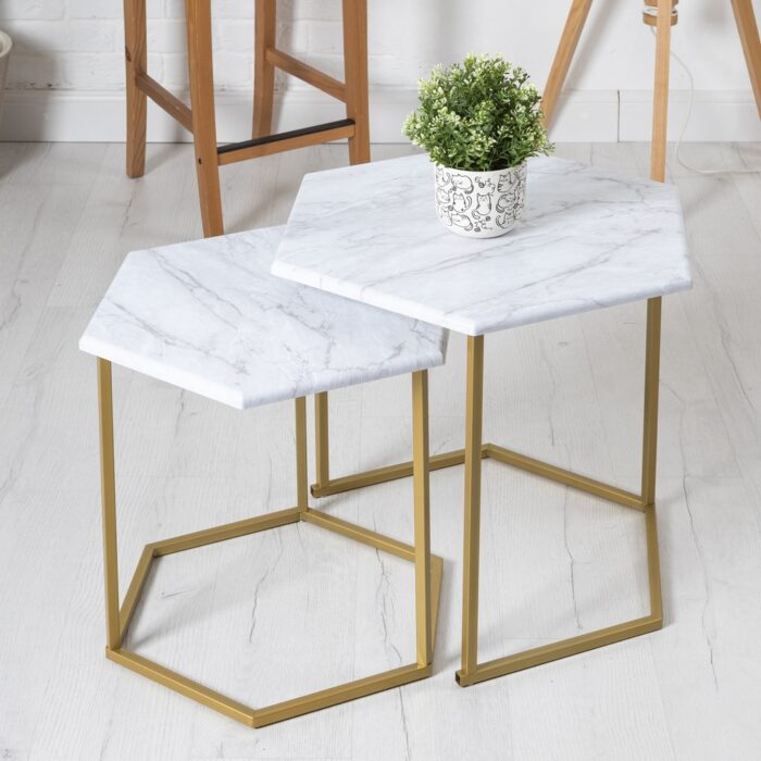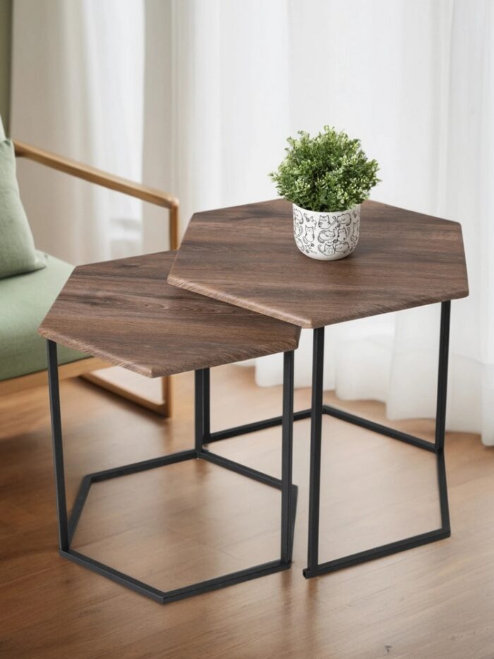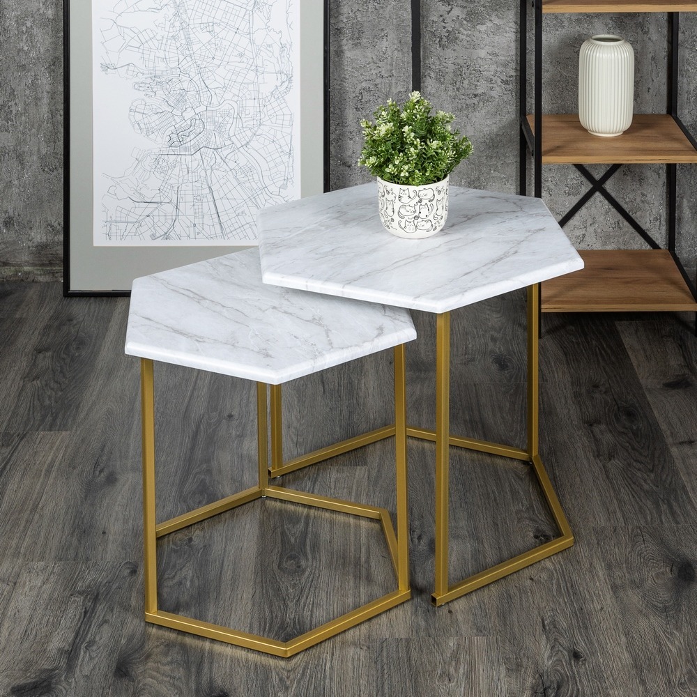 Журнальные столики МеталлАрт М003 выполнены в форме шестиугольника, что придаст вашему интерьеру стильный и оригинальный вид. Столешница из МДФ, покрытая пленкой ПВХ, обеспечивает устойчивость к высоким температурам и износостойкость. Металлический каркас гарантирует надежность и устойчивость к ударам и царапинам. Маленькая модель легко убирается под большую, экономя пространство и создавая дополнительные возможности для использования. В комплекте предусмотрены накладки из искусственного фетра для защиты пола.