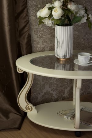 Классический журнальный стол украшен художественной гравировкой на столешнице, полке, ножках. Несколько цветов отделки на выбор, патинирование по резьбе и кромкам для придания изысканности.