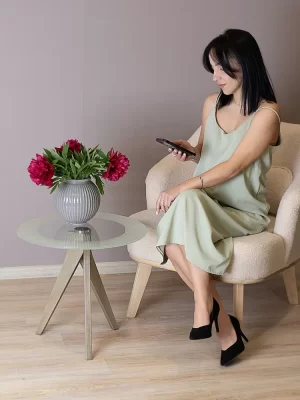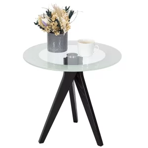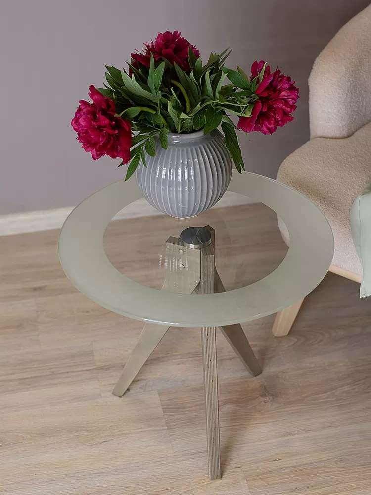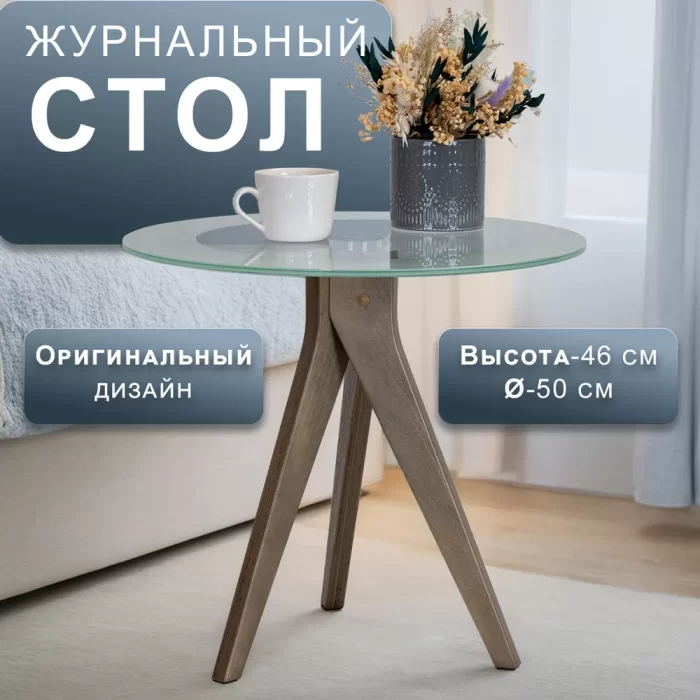 Журнальный столик Рилле 441 – это изящный и компактный предмет мебели, подходящий для любого интерьера от классики до лофта. Рилле 441 прекрасно справляется с ролью как журнального, так и прикроватного или придиванного столика. Опоры, выполненные из шпона берёзы (толщиной 24 мм), обеспечивают устойчивость, надёжность и долгую службу, а покрытие эмалью и тиснение с имитацией рисунка дерева придают столику естественную красоту. Обрамление круглой столешницы диаметром 500мм из стекла (8мм) пескоструйным рисунком шириной 80мм и минималистичный геометрический узор, который создают опоры, формой напоминающие бумеранг, подчеркнут уникальность любого интерьера.